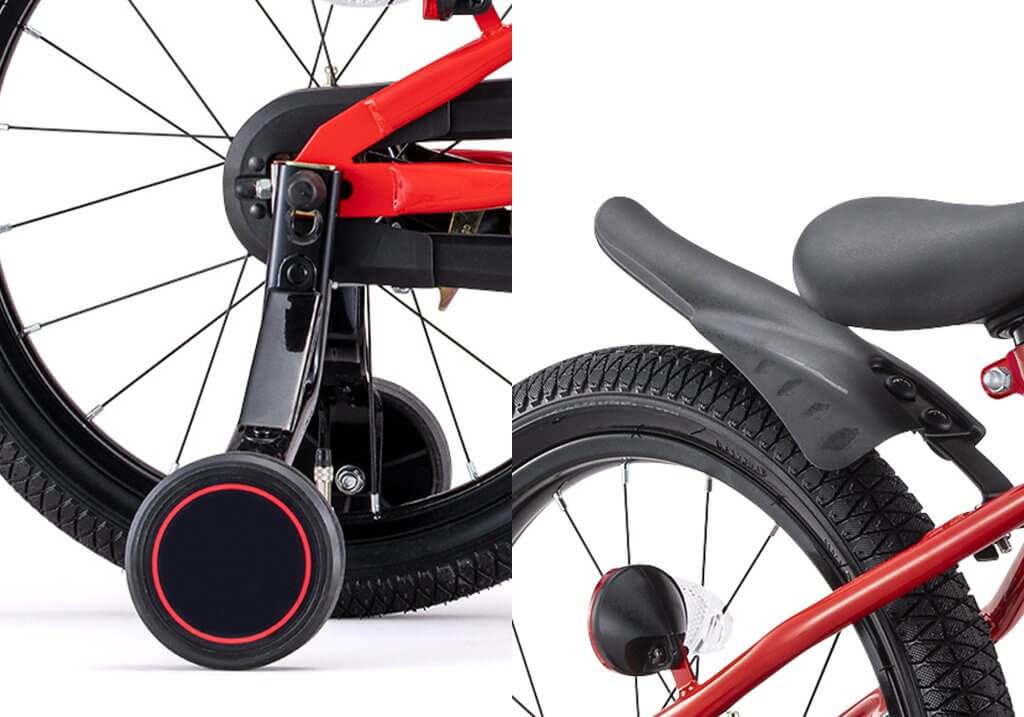 初めてでも子どもの恐怖心を和らげ安心して自転車練習が始められる補助輪と、雨上がりの自転車遊びや自転車練習でも安心な前後輪泥除け付き。