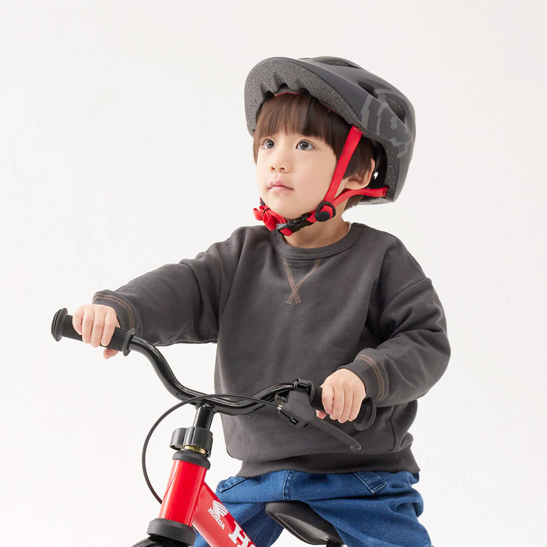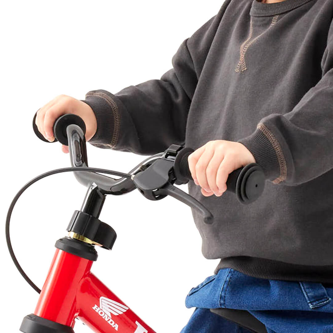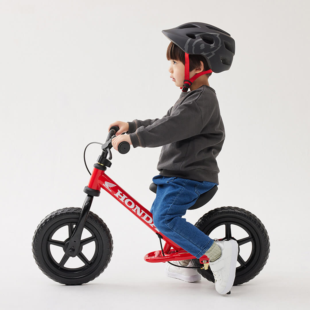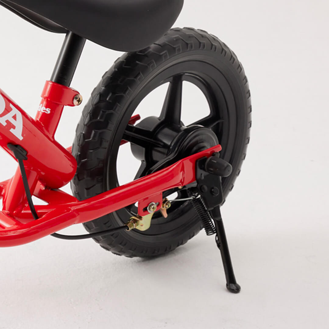 足で止まる癖がつかないブレーキ付き。将来の自転車デビューまでにブレーキで止まる習慣を身に着けられます。